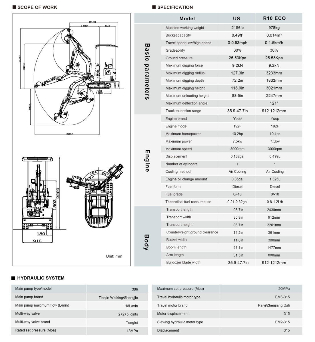All models come with a 30 cm toothed bucket without upgrades the R10 ECO has 1 cylinder Yoop engine, rigid arm and front control as standard. You can also choose from a variety of additional accessories, including buckets, grapples, and quick couplers.