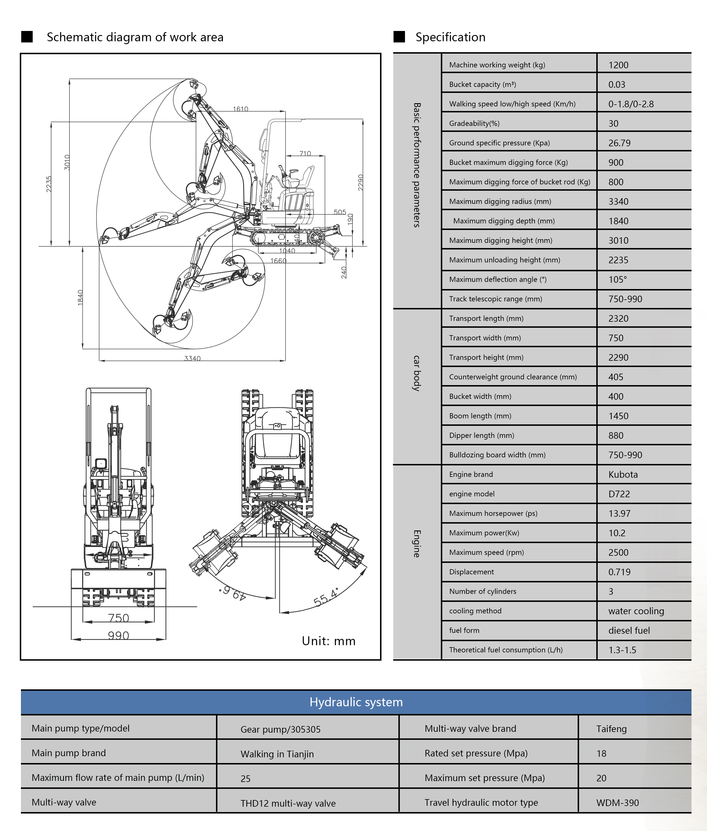 The R13 PRO is a versatile mini excavator with a working weight of 1200 kg, perfect for construction and garden projects. With a digging depth of 1.84 meters and a powerful Kubota diesel engine, it combines precision and efficiency. Ideal for professionals who value flexibility and reliability.